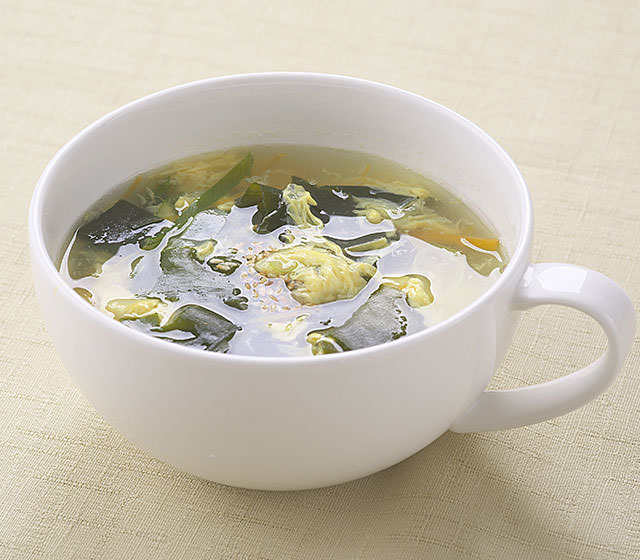 BAに、人参・長ネギ・わかめを入れてから溶き卵をまわし入れ、火を通します。