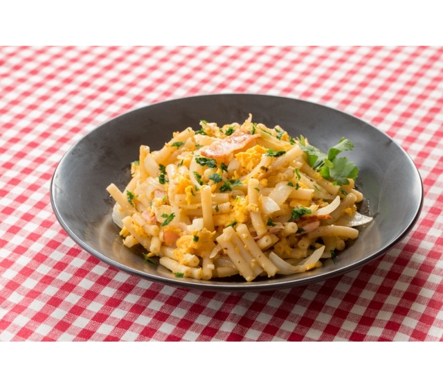 CBにマカロニとだしパックの中身を加えて炒め、全体に混ざったら溶き卵を回し入れます。ブラックペッパーをふり、らー油を少し加えてかるく混ぜ合わせて火を止めます。