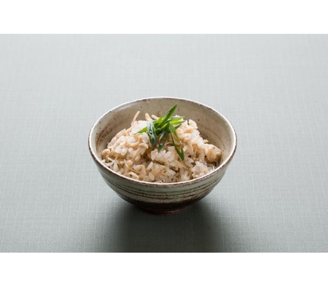 C炊き上がったらかるく混ぜ合わせて器に盛り、万能ねぎをのせます。