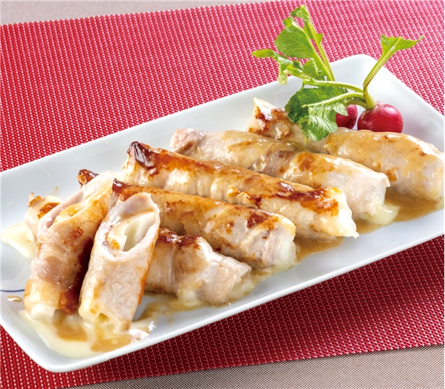 A豚肉を広げて@のちくわにチーズをのせて巻いていきます。