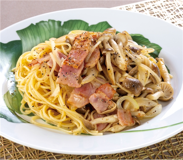 A玉ねぎとにんにくはスライスし、ベーコンは1.5cm幅に切り、しめじは石づきを切り細かくほぐします。